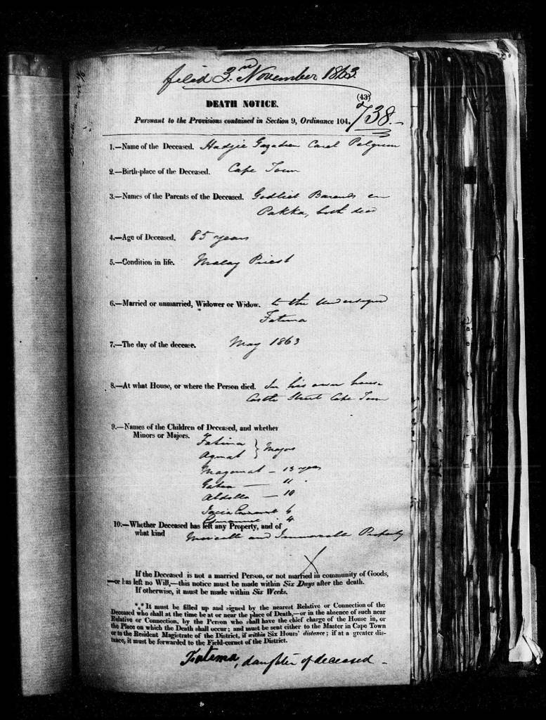 Meanwhile, Carel was charting a different course. Once free, he began to prosper. In 1817, he loaned Seymen of the Cape 600 Ridollars (a substantial currency at the Cape in the early 1800s, equivalent to several months of wages for a labourer) to enable him to free his slave daughter, Cananga. By 1822, he had purchased his own home in Matfeld Lane. Then, in October 1833, Carel and his wife made a joint will, identifying themselves as the free man Carel of the Cape, alias Gaszimoedien — formerly a tailor, now a teacher in the Arabic language — and Johanna Salomonse, alias Japoera, born at the Cape.