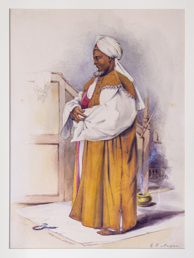 Another portrait, also by Angas, is held at the Castle of Good Hope in Cape Town. In it, Hadjie Gasanodien is more formally posed, with dignified composure. What amazes me most is his attire — a flowing Arabic coat, or abaya, layered over a long-sleeved thawb. The painting is filled with symbolic richness: incense burners still glowing in the frame, a minbar placed behind him as if ready for the next call to gather and reflect. To stand before that painting is to encounter the past as presence — not as myth or metaphor, but as family. His face, once anonymous to me, now echoes through mine. The ink of his story has always been part of my blood. Only now am I learning how to read it.
