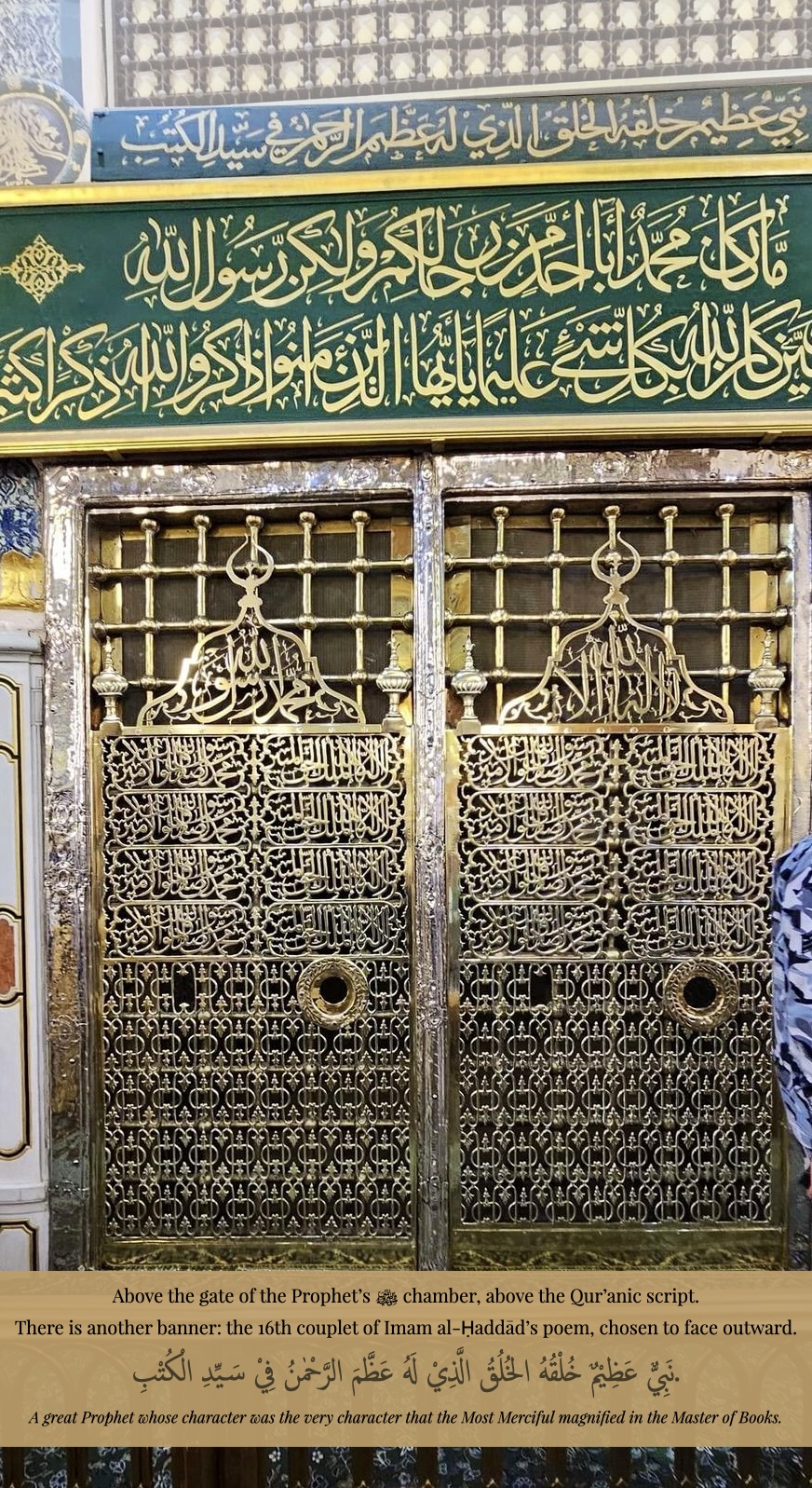 In the sacred precincts of Madinah al-Munawwarah, where pilgrims send peace upon the Prophet Muhammad (peace be upon him), few notice a quiet miracle. Above the gate to the Rawḍah — where our Prophet rests — is an engraved verse of Arabic poetry, nestled in plain sight. Most eyes pass over it, drawn instead to the Qur’anic verse below. But that upper verse is from a 40-couplet qaṣīda written by Imām ʿAbd Allah ibn ʿAlawī al-Ḥaddād — a saint, scholar, and Sufi of the Bā ʿAlawī lineage of Tarīm. Only one couplet of the poem is visible to the public.