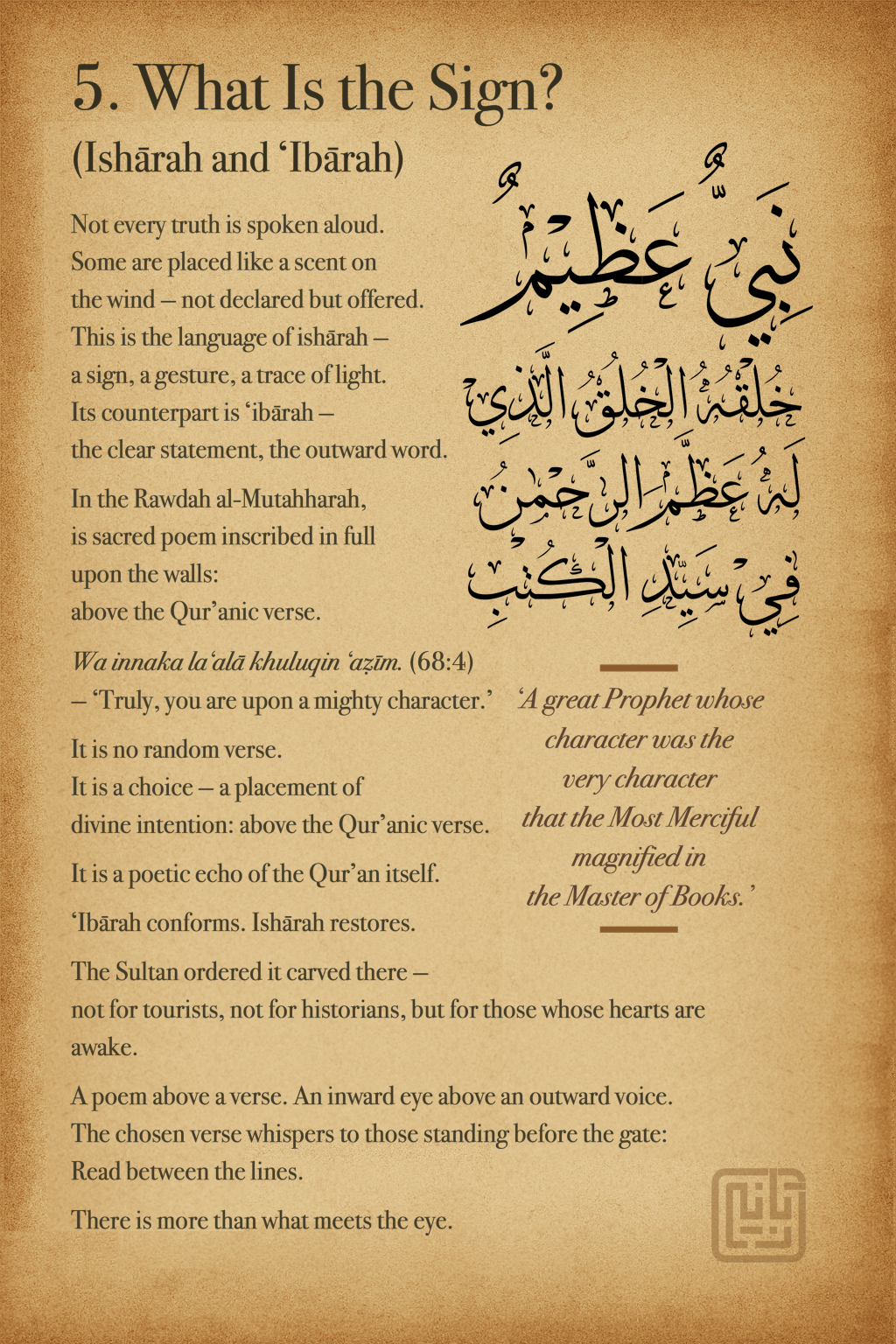 What is visible above the gate is the ʿibārah — the outward expression. But the choice to place this verse there is also an ishārah — a subtle sign. It whispers: Look closer. Listen deeper. The rest of the poem remains inside the sacred chamber, out of sight, like the hidden knowledge that only the heart can read.