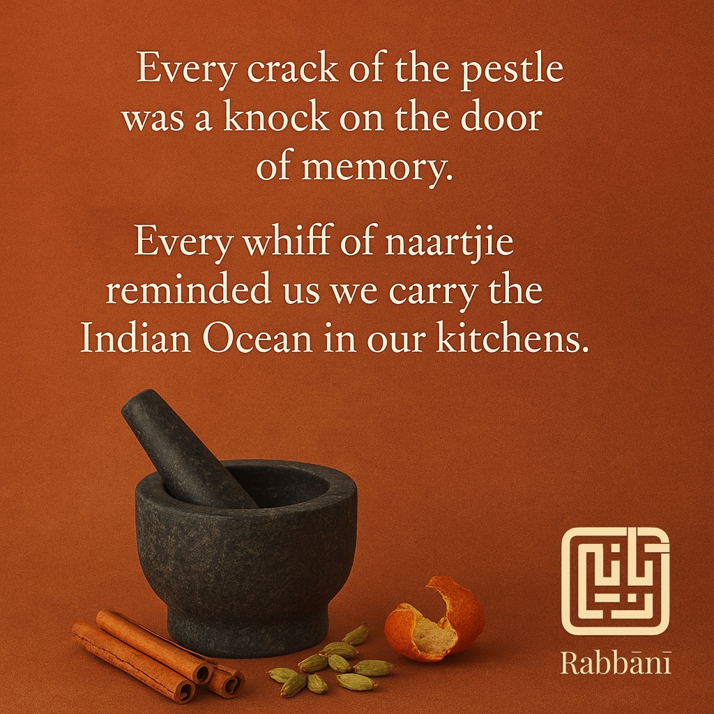 Spices that had crossed oceans with enslaved women were now ground by a child’s hands on a Cape Town stoep, ready to become part of Sunday morning koesisters. Every crack of the pestle was a knock on the door of memory, every whiff of naartjie a reminder that we carry the Indian Ocean in our kitchens.